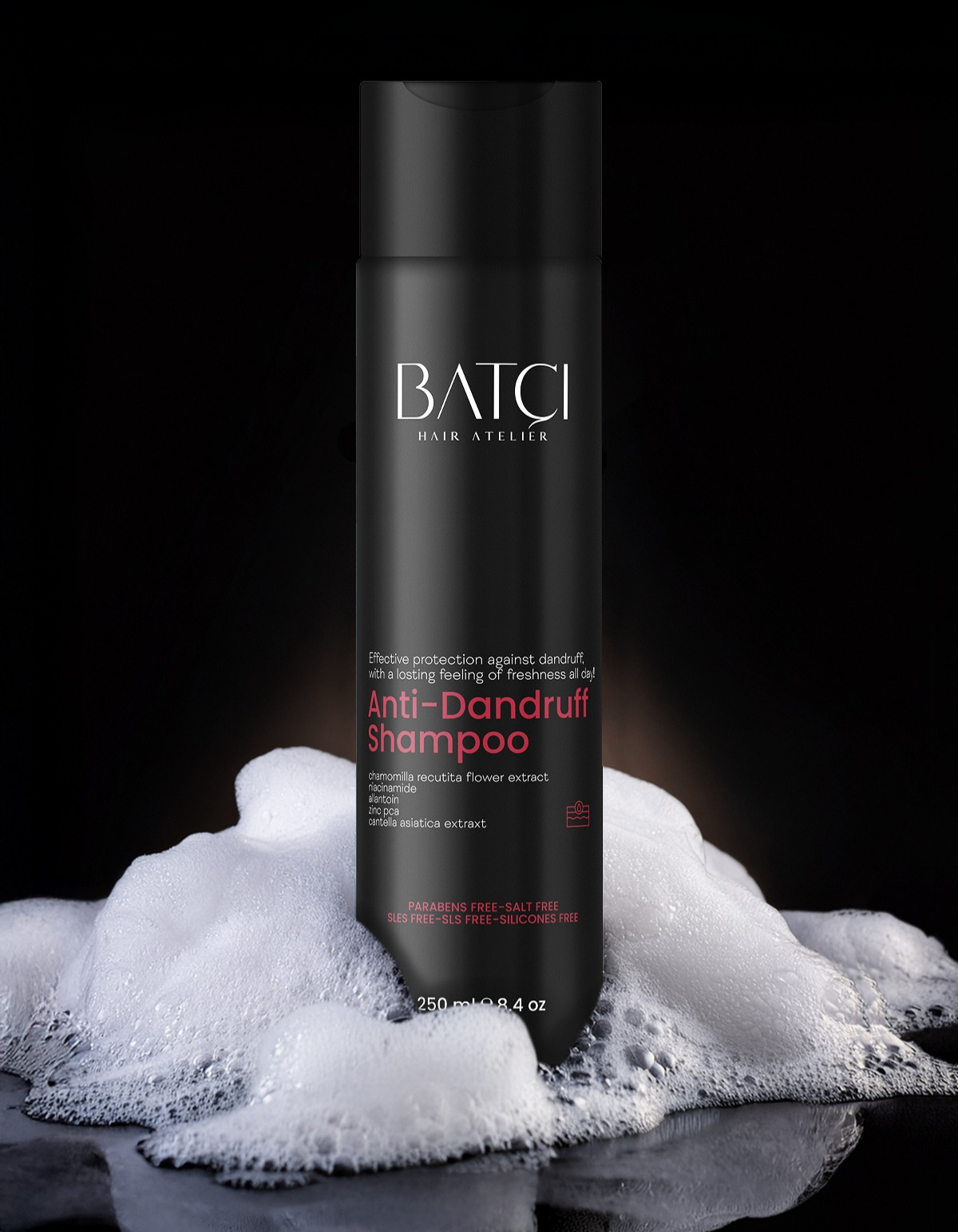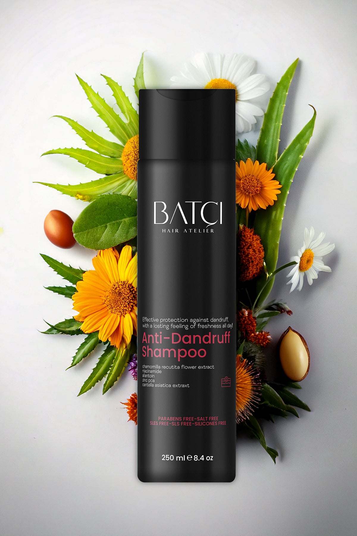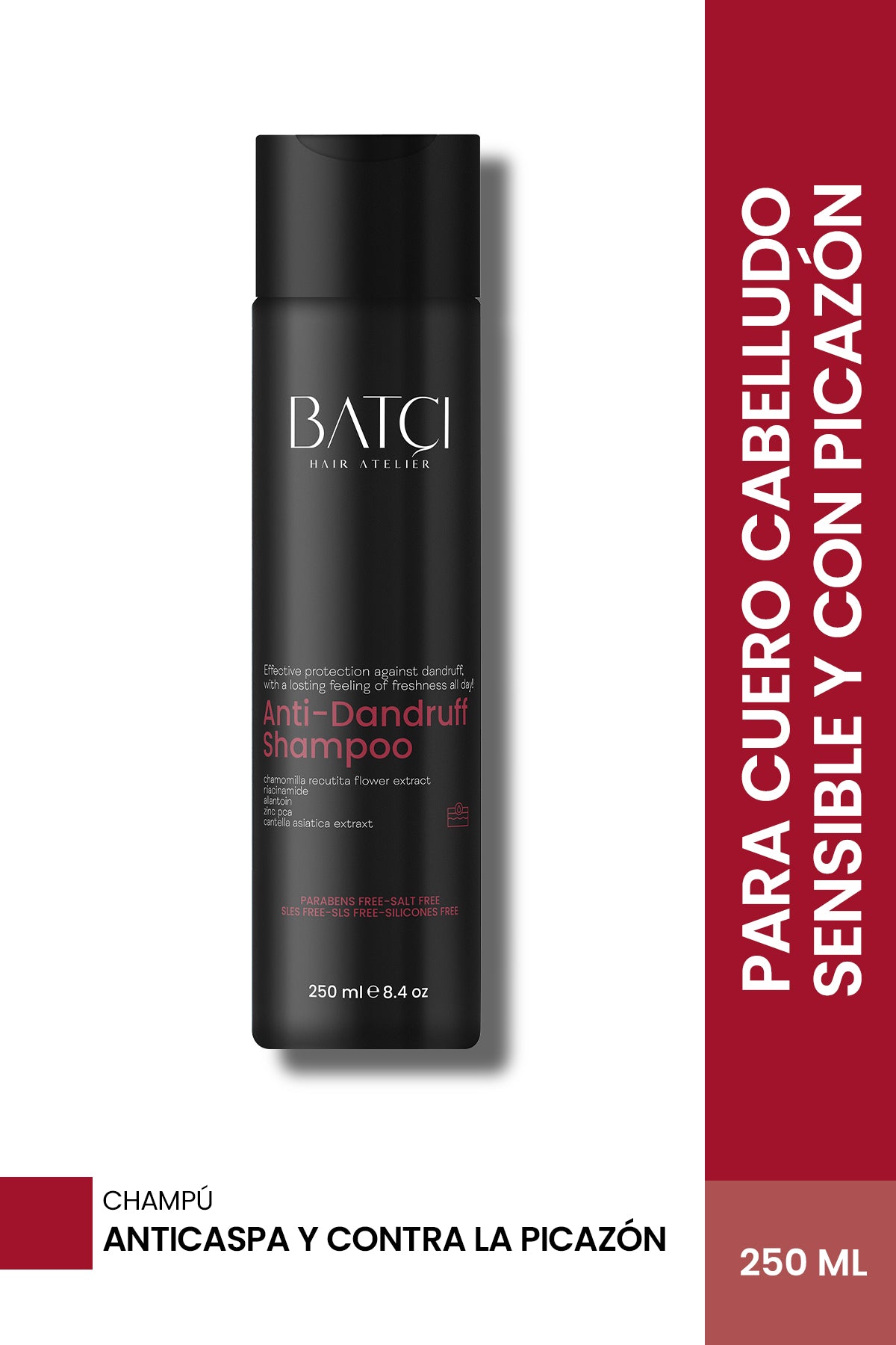 Considerando la sensibilidad de tu cabello y cuero cabelludo, ¡hemos formulado el champú anticaspa BATCI específicamente para ti! Su fórmula suave pero eficaz, con cinco ingredientes activos, protege tu cabello y cuero cabelludo del daño natural, el enrojecimiento, la irritación, la caspa y la caída del cabello. Ayuda a que tu cabello reciba el cuidado que merece
